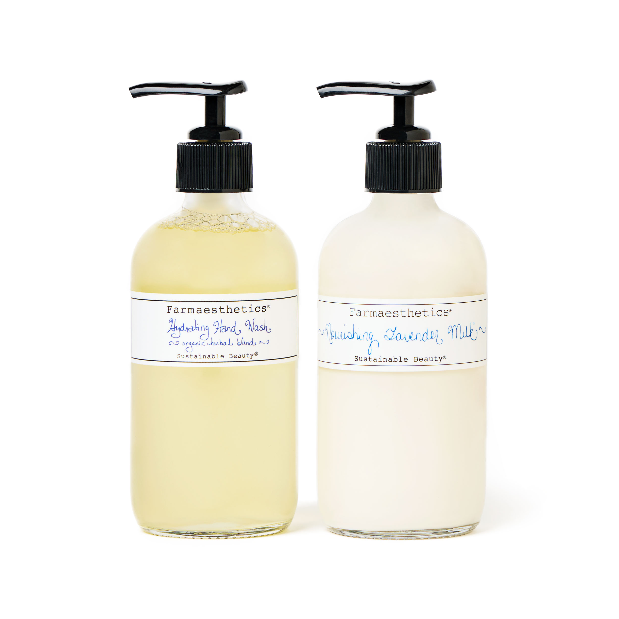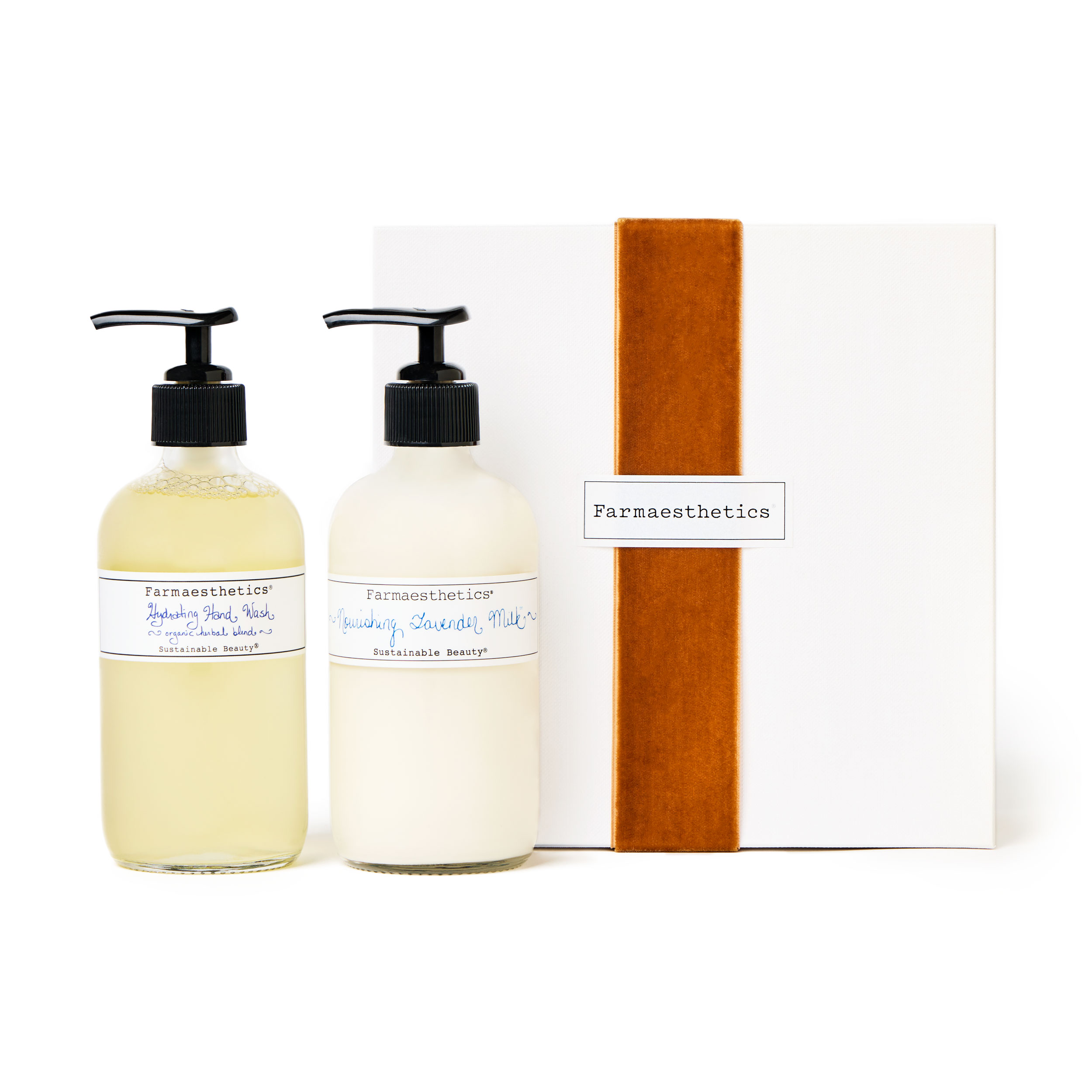 The perfect sink-side combo: Hydrating Hand Wash and Nourishing Lavender Milk (both full-size) packaged in a white linen box with a velvet ribbon. Hydrating Hand Wash cleanses without drying or stripping the skin, and Nourishing Lavender Milk quickly soaks into the skin to deeply hydrate- with a scent that is oh-so relaxing. These two beautiful glass bottles elevate any space! Retail value of $74.